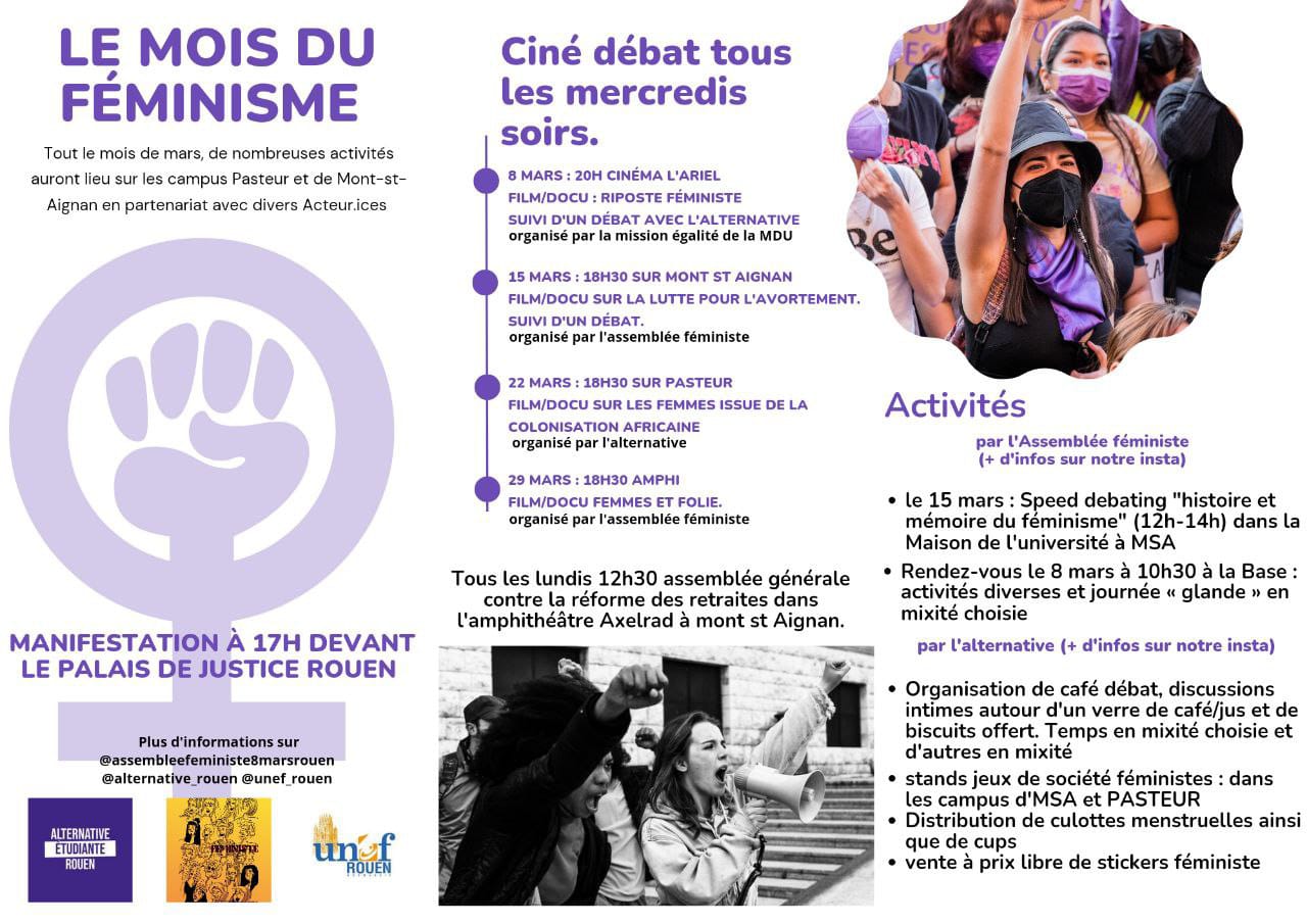 Le mois du féminisme, porté par l’Alternative étudiante de Rouen, l’Unef Rouen et l’Assemblée féministe et dont le programme est à retrouver en cliquant ici.