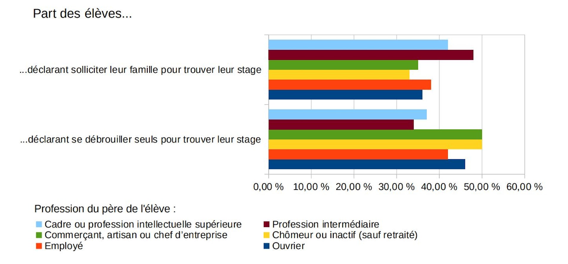Si la recherche de stage a pu être d’autant plus compliquée, certaines entreprises comme les hôpitaux ou les crèches n’accueillant plus d’élèves de troisième dans ce cadre de leur stage, l’enquête confirme l’importance du réseau familial. À noter : les élèves issus des couches moyennes semblent davantage enclins à compenser un moindre capital social par une plus forte propension à candidater par eux-mêmes auprès des employeurs. L’enquête met en outre en lumière les différences notables quant à la nature des stages effectués.