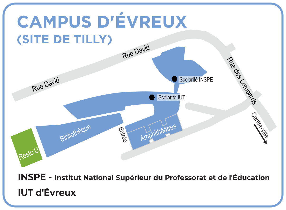 Le Campus d’Évreux comprend deux sites : Tilly et Navarre. Le site de Navarre regroupe l’IUT d’Évreux, ouvert depuis 1995 et accueillant plus de 800 étudiants dans de nombreux départements de formation, et une antenne de l’UFR Sciences et Techniques. Le site de Tilly accueille quant lui une antenne de l’INSPE.